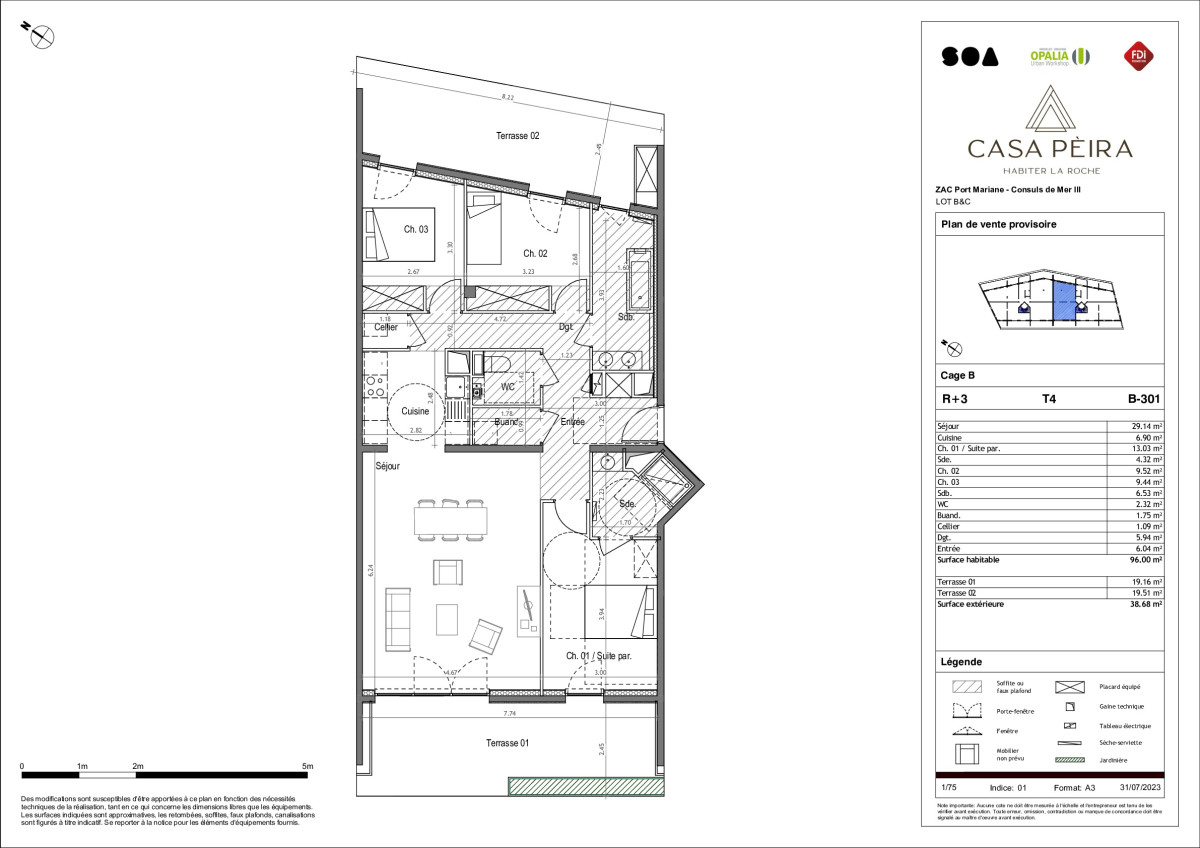 | B401 | 4 | Appartement + Garage sous sol + Garage sous sol Terrasse de 38,74 m² 2nd terrasse de 38,72 m² | 4p | 96,00 | 20 % | Plan | 520 000 € |