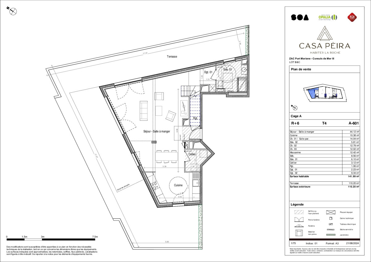 | A601 | 6 | Appartement + Garage sous sol + Garage sous sol + Garage sous sol Terrasse de 110,20 m² 2nd terrasse de 110,20 m² | 4p | 141,99 | 20 % | Plan | 899 000 € |