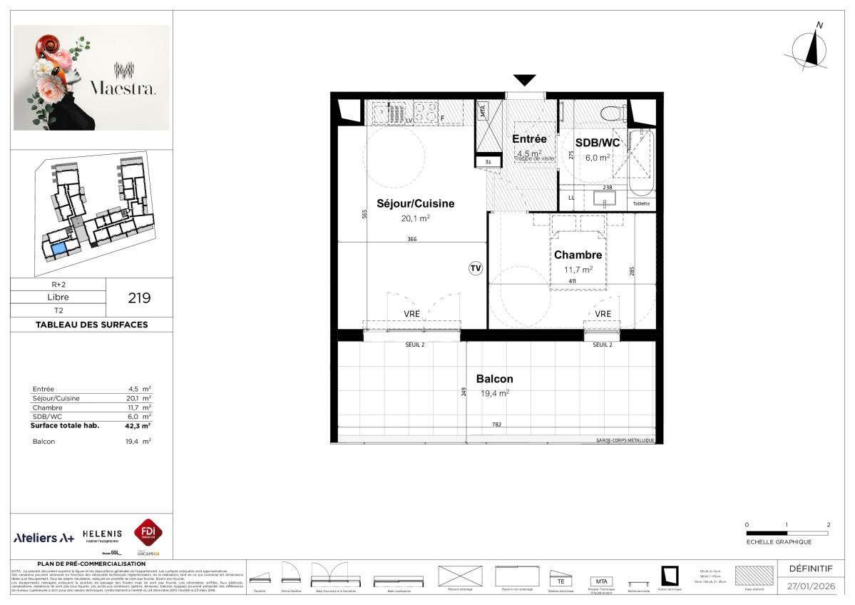 | A219 | 2 | N° de lot A219. Appartement + Parking sous-sol Balcon de 19,40 m² | 2p | 42,30 m² Plan | 5,5 % | ![]() | Plan | 217 154 € |