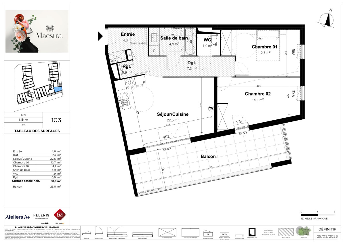 | A103 | 1 | Appartement + Parking sous-sol + Parking sous-sol Terrasse de 23,50 m² | 3p | 68,90 | 5,5 % | ![]() | Plan | 282 213 € |