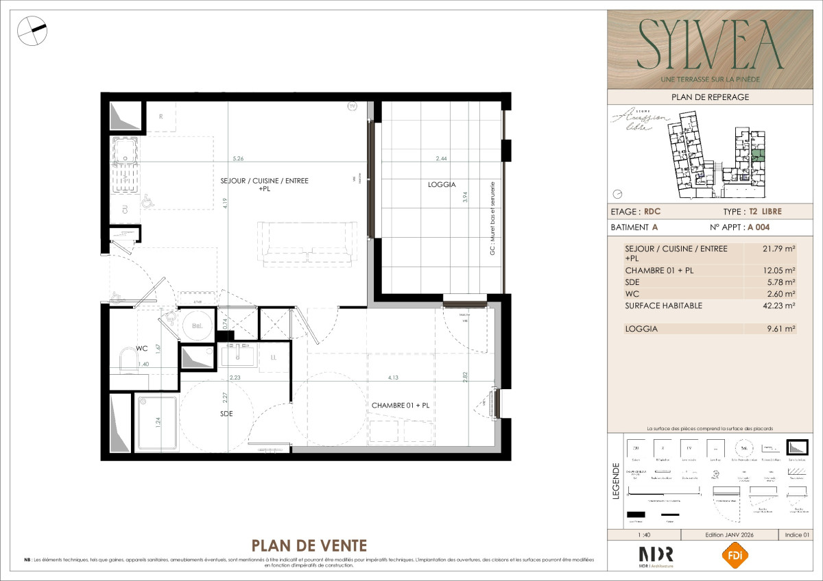 | A004 | 0 | Appartement + Parking sous-sol + Parking sous-sol Terrasse de 9,61 m² | 2p | 42,23 | 20 % | Plan | 218 000 € |
