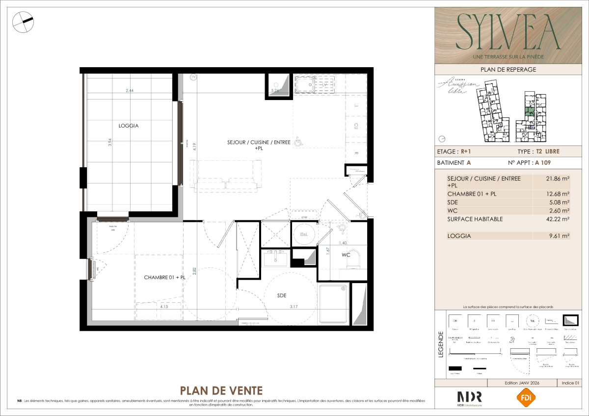 | A109 | 1 | N° de lot A109. Appartement + Parking sous-sol + Parking sous-sol Terrasse de 9,61 m² | 2p | 42,22 m² Plan | 20 % | Plan | 222 000 € |