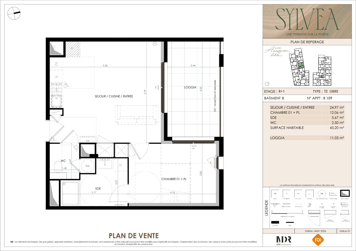 | B109 | 1 | Appartement + Parking sous-sol + Parking sous-sol Terrasse de 11,03 m² | 2p | 45,20 | 20 % | Plan | 235 000 € |